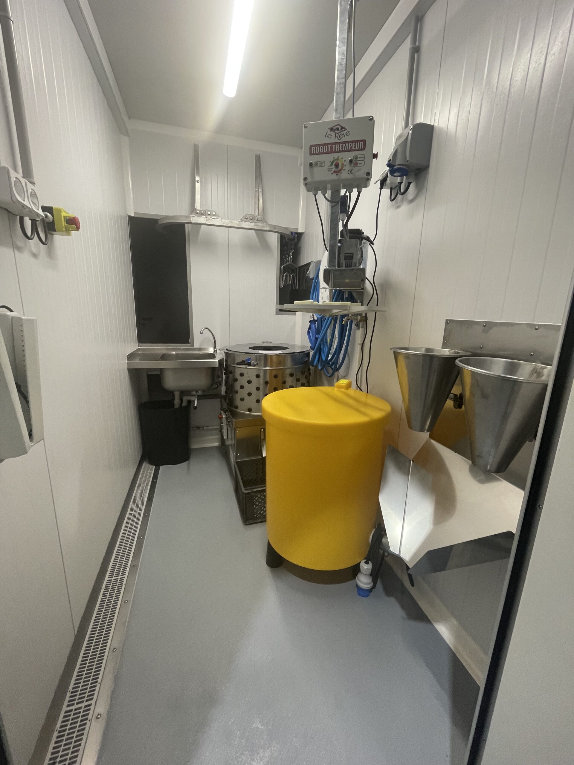 Conforme aux normes sanitaires françaises et aux réglementations européennes, cet atelier permet l’abattage de jusqu’à 250 poulets par jour (cadence entre 20 et 30 poulets/heure). Il peut accueillir simultanément jusqu’à trois opérateurs.